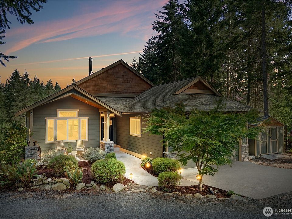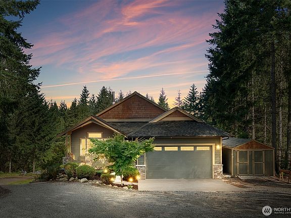 PRICED TO SELL! Discover serene living on 5 private acres in gated Carbon River Highlands! This daylight basement rambler offers nearly 2,500 sq. ft. with an open layout, cozy wood stove, and a stylish kitchen featuring quartz counters, SS appliances, and a large island. The main level boasts an owner’s suite with dual closets and spa-like bath, plus an office, bedroom, full bath, and laundry. Downstairs: oversized bedroom with walk-in, full bath, second utility, pellet stove, sauna, and generous storage. ADU Potential!! Enjoy a 3-car garage (2 up, 1 down), tool shed, fenced deer-proof garden, RV parking with 30-amp hookup, and generator wiring—your private retreat with modern comforts!
