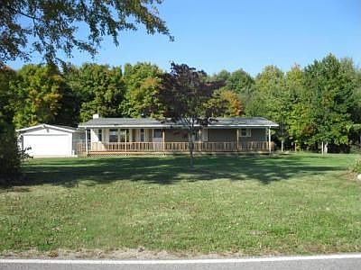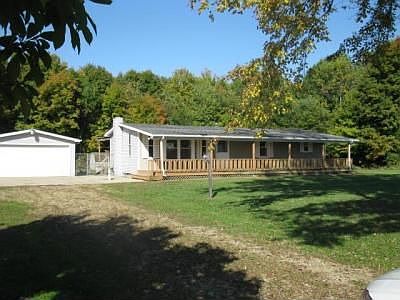 COUNTRY LIVING! - This 2 1/2 acres +or- boasts mature shade trees and a lazy front porch. 2 bdrms, 2 car garage. Ranch home room home with full basement ready for you to finish. Galley kitchen with eating area, nice size living room with laminate floors. Fenced rear yard, above ground pool, 2 car garage. Interior needs some cosmetic work. There is no furnace in this home. Selling as-is. All information believed to be accurate but should be confirmed by buyer.