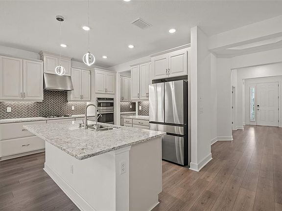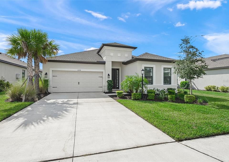 Built in 2023 by Taylor Morrison, this thoughtfully designed 4-bedroom + office, 3-bathroom home is filled with high-end features and modern finishes. The front guest bedroom offers ample space and privacy, complete with its own bathroom featuring a tub/shower, oversized tile to the ceiling, Quartz countertops, and a dedicated linen closet. The private office is ideally positioned just off the main living area, making it a perfect space for a home office, studio, or quiet den. Two additional guest bedrooms share a well-appointed bathroom, also finished with a tub/shower and oversized tile to the ceiling, Quartz countertops, and a separate linen closet. Adjacent to this space is the laundry room, thoughtfully equipped with a washer, dryer, and built-in cabinetry for added convenience and storage. The upgraded gourmet kitchen is a true highlight, boasting beautiful Quartz counters, an abundance of cabinetry and drawers, GE appliances, a sleek Samsung refrigerator, and additional prep and storage space provided by a butler’s pantry and a large walk-in pantry. The expansive great room and dining area accommodate a variety of furniture configurations, while 11-foot sliding glass doors provide abundant natural light and open fully to create seamless indoor-outdoor living. The spacious Owner's Suite is a private retreat featuring a luxurious en-suite bath with a garden tub, upgraded shower, dual Quartz vanities, and an oversized double-decker closet featuring metal hanging rods and integrated shelving. Additional home features include luxury vinyl plank flooring throughout, plantation shutters, gutters, a triple-filter water system, and a powerful 22kW whole-house Generac generator for peace of mind. The expansive 22-foot lanai offers a perfect space to enjoy the pleasant weather, featuring panoramic screening that provides uninterrupted views of the lush, green backyard. Just a short distance away, the community amenities include a tot lot, basketball and volleyball courts, a soccer field, dog park, and a sparkling pool/spa area with a grill—offering something for everyone to enjoy! Located in southeast Manatee County, Park East at Azario has convenient access to shopping, restaurants, schools, and lots of entertainment and recreational choices. Call now to schedule your private showing.