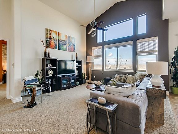 Have unobstructed mountain views and open space from this ranch home! An open floor plan brings the outside in with vaulted ceilings and a multitude of windows. The open, airy great room with vaulted ceilings, continues to the dining room and kitchen complete with maple cabinetry, tile counters and backsplash, stainless appliances, a breakfast bar and wood floors. The master suite has vaulted ceilings and a dramatic stone-wrapped niche and a master bath with separate vanities, a soaking tub and a walk-in shower. One bedroom is a perfect office, distinctive with its wood-faced wall. Another bedroom is nearby, as is a full bath. The laundry has custom cabinetry, a folding counter and a utility sink. The basement is ready for additional living space and has exercise and storage areas. The backyard has a tiered patio and open space views. A sprinkler system is installed for the front and back yards. A two-car attached garage has custom shelving, concrete countertop and custom bike storage.