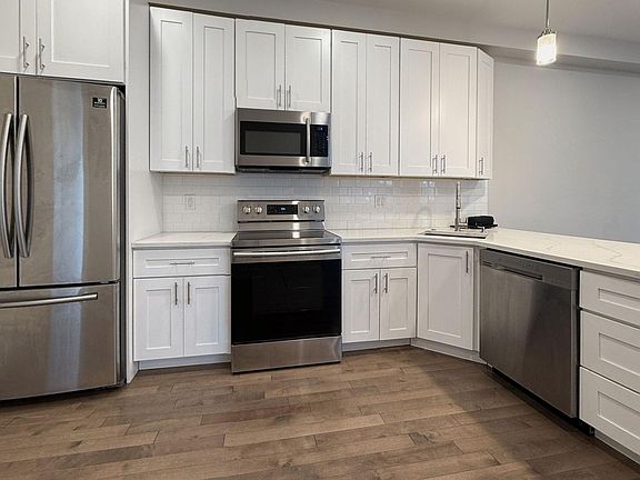 The kitchen is a standout feature, boasting sleek white cabinetry, stainless steel appliances, and a subway tile backsplash. It's equipped with modern amenities, including a built-in microwave, electric range, and French door refrigerator, perfect for the culinary enthusiast.