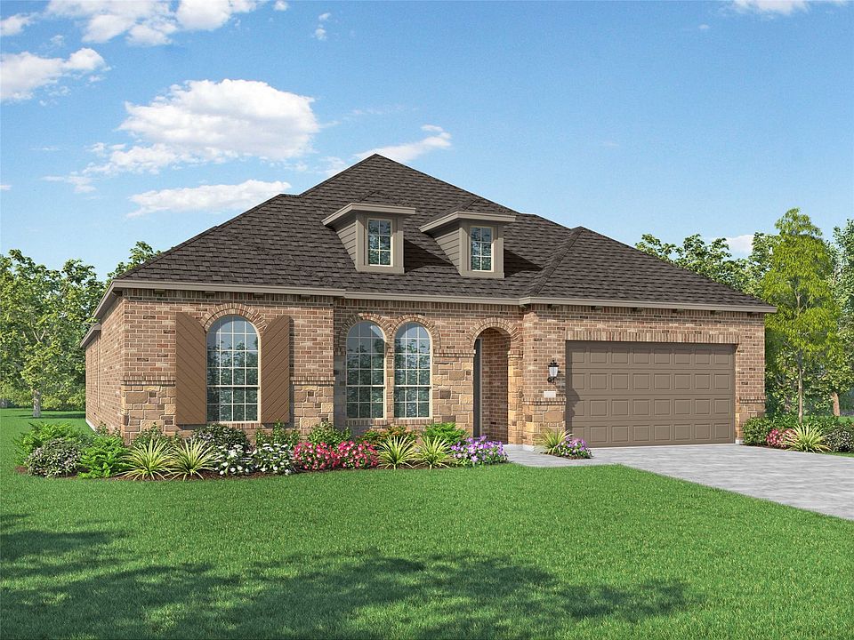 MLS# 20574640 - Built by Highland Homes - Ready Now! ~ Beautiful Mediterranean Single story with designer finishes throughout. Exceptional lot that backs up to the greenbelt - privacy and a view! Stunning kitchen with white cabinets, black lower cabinets and island for a wonderful contrast. Upgraded kitchen sink, quartz countertops, double stacked cabinets with glass and puck lights, trash can pullout. Cozy fireplace, wood flooring in main living areas, nice entertainment room for movie night, all in an energy efficient home. Wonderful neighborhood with community pool, pickleball court, and walking trails!!!