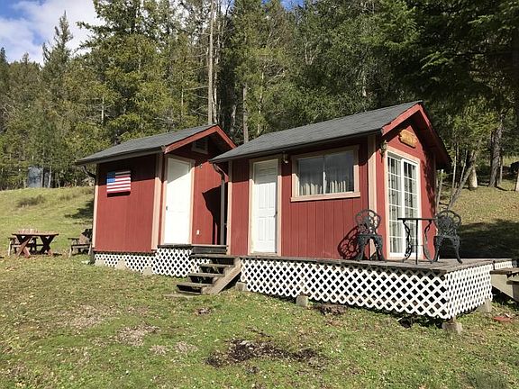 Main cabin with metal roof, covered porch and open floor plan, plus 2 additional sleeping cabins, a carport and a place to hook up your RV, all on approx. 15 acres before Ruth Dam. Property above the cabin is wooded and sloped with flat usable space around the cabins. Property has 2 creeks running through it and a total of 3500 gallons of storage tank for water. Fenced on 3 sides and goes across the road to the middle of the Mad River below. Great for full time living or a summer get away. Electricity no gas. fully furnished with extra tool to maintain home. Wood stove in main cabin. washer dryer hook-ups.