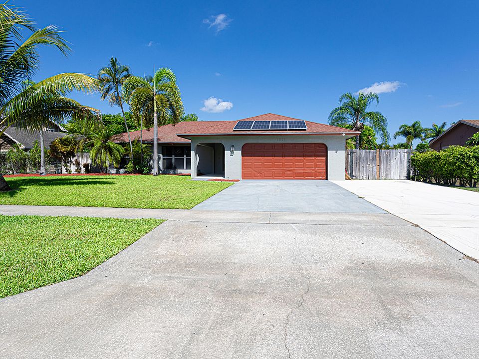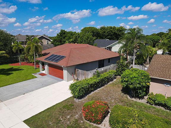 Welcome to this stunning 4-bedroom, 2.5-bathroom home with a 2-car garage and fully paid-for solar panels. NO HOA. This property boasts a renovated interior design, featuring a modern kitchen with new appliances, an open concept layout, and wood floors in all bedrooms. The master bed/bath has been elegantly renovated, showcasing dual sinks and a spacious walk-in closet. Enjoy the privacy of a fenced lot with a shed in the backyard, as well as both an open and covered patio perfect for outdoor entertaining. Conveniently located close to the world-famous equestrian club, Wellington Green Mall, and the Southern Highway, with major shopping centers nearby, this home offers both luxury and convenience.