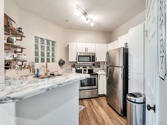 Updated Condo on the top floor. Vaulted ceilings! Turnkey condition! Charming condo located in the highly desirable Pinnacle at Highline community in Littleton. This unit has a wonderful private feel. Maintenance free living is accentuated with community amenities that include a beautiful outdoor pool, hot tub, fitness center and clubhouse. The unit itself has an open plan with an airy feel and ambient light. There is an ample dining area situated between the living room and kitchen along with a Laundry Room/Pantry. The spacious bedroom has a wonderfully updated bathroom! This fantastic unit has it all - phenomenal location near trails, shopping and restaurants yet is conveniently tucked away providing a quiet, serene spot. Adjacent to the the Highline Canal for walking, biking and hiking! Near parks restaraunts and shopping. The Garage and Reserved Parking convientely located and the visitor parking is nearby for guests!