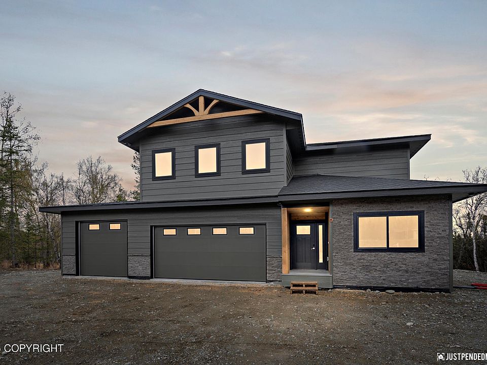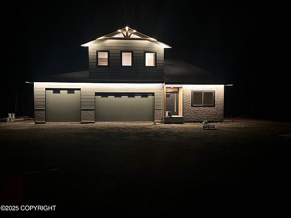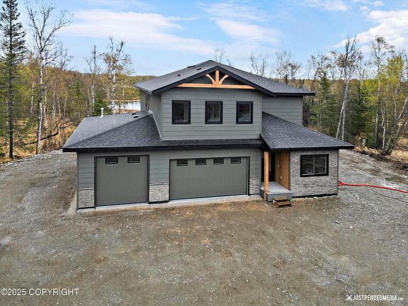 NOW COMPLETE! Bordering a 29-acre greenbelt and Patty Lake, located on a treed one-acre lot in the popular Valley Ridge Subdivision, just five minutes from the center of Wasilla. Bed & full bath on the main living level. Spacious entryway leading into an open-concept great room w/large windows showing the lake views, gas fireplace, kitchen filled w/light, quartz countertops MOREan eat-at island, and a large pantry. The primary suite is a relaxing space with a stand-alone tub, walk-in shower, dual sinks, and a large 94-square-foot walk-in closet. Three additional bedrooms, a family room, and a laundry room with a window are all located upstairs. 200 sqft covered deck overlooking the lake. The oversized 958-square-foot three-car garage provides ample space for vehicles, a workshop, and a handy bench in the mudroom for everyday use. Under eave lighting on the front of the home. Easy access to nearby Lake Lucille Park, featuring 70 acres of parkland with a fenced dog park, soccer field, walking trails, picnic tables, pavilions, and public lake access. Downtown Anchorage is just a 45-minute drive away, and this home combines peaceful living with convenient access to city amenities.