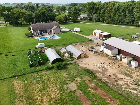 Beautiful 7.31 -Acre Country Estate with Home, Pool, Pole Barns & Creek Access - Built in 2017. This exceptional property, situated on a peaceful dead-end road, offers a rare combination of modern comfort and rural charm. Built in 2017, the home features 9-foot ceilings that continues through out the basement. This home is equipped with a highly efficient geothermal heating and cooling system. Enjoy outdoor living with both a covered front porch and a spacious back patio. The partial concrete driveway leads to a 2-car attached garage. Inside, the home boasts 3 traditional large bedrooms with closets, plus 2 additional rooms currently used as bedrooms. The large Master suite includes a separate shower and soaking tub. This home has a total of 2 full baths, 1 half bath and plumbing in place for a future bathroom in the basement. The basement also features a large entertainment area and 2 rooms off that. The open-concept main living area includes a spacious living room, formal dining area, breakfast nook, and a large kitchen with a bar featuring a built-in cooktop, double ovens, and a walk-in pantry. Outdoors, enjoy your own private oasis with a large in-ground swimming pool, complete with slide, diving board, surrounding patio, and a fire pit - perfect for entertaining. The property consists of two separate tracts totaling 7.31 acres, offering recreational and agricultural potential: 2-acre tract: Includes the primary residence and a smaller storage shed. 5.31acre tract: Features a large 40' x 96' insulated pole barn with electricity and water, a 20' x 24' barn with a concrete floor, and an additional 15' x 20' enclosed lean-to with packed limestone floor. This tract is a second potential building site.