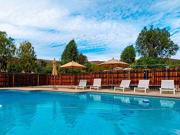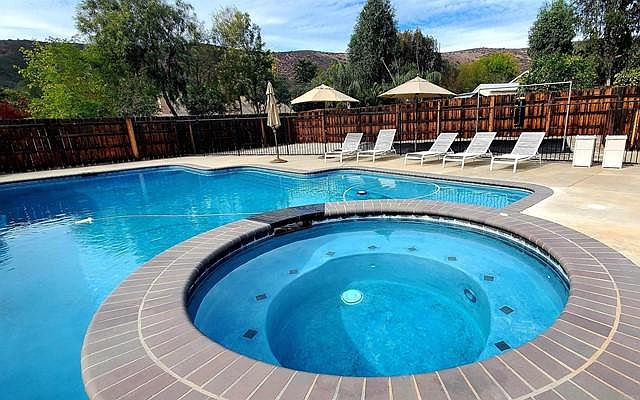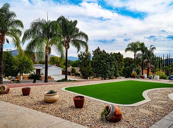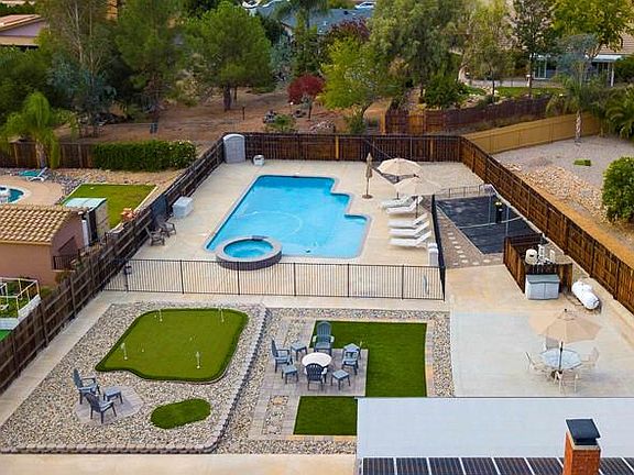 Come home to a resort everyday. Inground pool and spa, expansive Baja step with umbrella stand, outdoor shower and your own putting green. Appx. 1/2 acre, large covered back patio, fruit trees. Owned solar for low utility bills. Four bedroom quality home for growing families features hardwood flooring, vaulted ceilings, impressive fireplace passes through to living and family room, extra large laundry room. Luxury master suite with backyard access, walk in closet with custom built-ins, sunken tub.