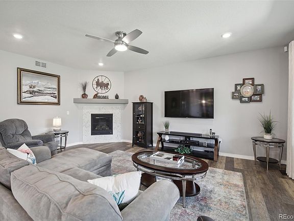 Exceptional Lennar home with over $50K in upgrades and desirable features! This bright east-facing property is nestled in a beautifully landscaped setting, featuring an advanced exterior lighting system and irrigation. You’re welcomed by an inviting open floor plan accentuated by contemporary laminate flooring and a cozy gas fireplace. The light and open kitchen boasts sleek granite countertops, a spacious island, a large pantry, and stainless steel appliances, including a new Bosch dishwasher. Abundant cabinet space, enhanced with undermount lighting, combines style with practicality, while a built-in desk area with a granite countertop and additional cabinets provide even more storage. The finished 3-car garage is a standout feature, boasting over $20K in upgrades, including epoxy floors, custom cabinets, a workbench, and enhanced lighting. The main floor office, framed by elegant French doors, provides a productive workspace. Upstairs, you’ll find four generously sized bedrooms, including a luxurious primary suite with a five-piece bathroom and a spacious walk-in closet. Enjoy partial mountain and park views from this serene retreat. The guest suite showcases an attached bathroom, while the other two bedrooms share a Jack & Jill bathroom. The partially finished basement is ready for your personal touch, with drywall, baseboards, and sealed floor seams, and is pre-plumbed for a future bathroom. Outside, discover recently re-stained fencing, sealed sidewalks, and a new concrete patio. Additional features include buried downspouts, window well covers, custom cellular shades, and an ADT alarm system. The home is equipped with two AC units and two furnaces, both maintained annually, a home humidifier, and smart home technology. Conveniently located near the Larkridge shopping center with quick access to I-25 and E-470.