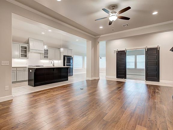 Rare 2,188 sf home with 2 living areas in Monarch Ridge! This open concept beauty boasts a dreamy flex room with vaulted ceilings and beam filled with natural light. Entertainer's delight with an over-sized dining area and large kitchen island overlooking the hardwood floors in the living room. Spacious primary bedroom with primary bathroom featuring split vanities, tile shower, and soaker tub. You will appreciate the extra storage space in the garage and 64' depth back yard perfect for outdoor entertainment. Garage is extra deep to park both cars and plenty of room left for the above ground storm shelter. Refrigerator, washer, and dryer included!