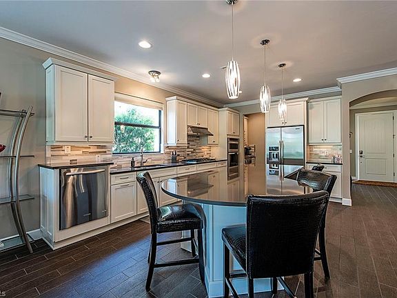 Entertaining is wonderful in this lovely home! The kitchen boasts natural gas appliances, as well as a separate nook with a built-in wine rack and refrigerator. There are beautiful quartz countertops, upgraded KitchenAid appliances, and a full pantry. Continue outside to the covered lanai space and you will enjoy the pool/spa that are both heated by gas. Beyond the pool area is a pond with a preserve view beyond that! This model has two master bedrooms, one on the main level and the other upstairs. The upstairs also has a family room that acts as a nice retreat space for guests or living space for family members. This home has hurricane impact glass and doors. There are many additional upgrades and there will be a list provided upon request.