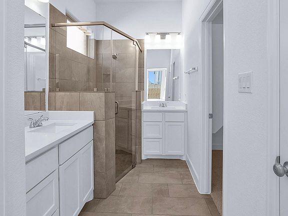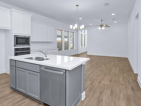 READY FOR MOVE-IN! Entry leads to open family room, dining area and kitchen. Large windows and 10-foot ceilings throughout. Kitchen features generous counter space, 5-burner gas cooktop, corner walk-in pantry and large island with built-in seating space. Primary suite includes bedroom with 10-foot ceiling. Double doors lead to primary bath with dual vanities, separate glass-enclosed shower and walk-in closet. Covered backyard patio. Mud room with adjoining closet is just off two-car garage.
