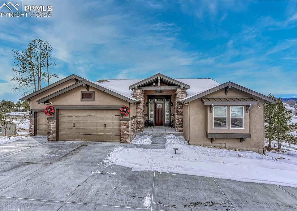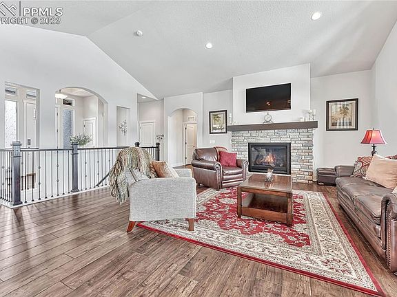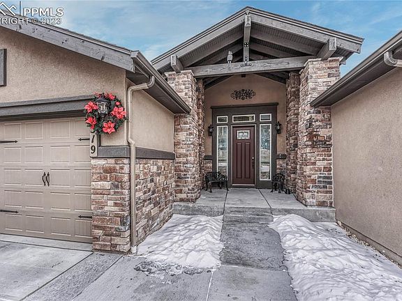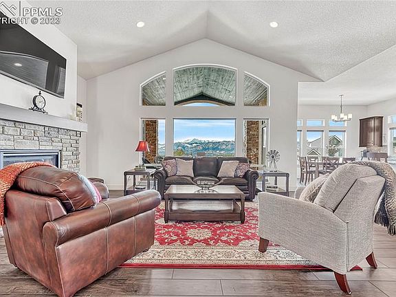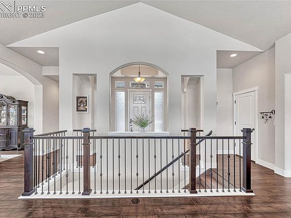 Why wait to build when you can have THIS gorgeous home that is only a year old!! Not only will you be mesmerized with the views of Pikes Peak you will love all the custom features included in this home. This is a 5 bedroom, 5 bath home that was built with a lot of love and careful consideration. The kitchen is a cooks dream with the large island and upgraded Kitchen Aid appliances and a nice sized pantry. The covered deck is off the nook area for those breathtaking bronco sunsets we have here in Colorado. This home also has a spacious separate dining area for those family dinners. The main level has the primary bedroom that features a beautiful 5 piece bathroom with upgraded tile in the shower that makes it feel like you are at a spa! Laundry is also located on the main level with a sink. One of the 5 bedrooms is also on the main level with a full bathroom right outside the door. There is a state of the art security system which includes 8 cameras that surround the house. Window coverings have the top down bottom up feature that is great for privacy but allows you to still see the mountains! Landscaping was just installed with trees that line the side of the property for added privacy. This home has a walk out basement that has 3 additional bedrooms with a fireplace to enjoy those cold winter nights while watching a movie. There is a jack and jill bathroom that adjoins two of the bedrooms. The other one is a ensuite for your guests to enjoy their privacy. There is also a half bath downstairs as well. And finally Sanctuary Pointe... this is the IT neighborhood to be in! Not only is it beautiful but it boasts walking trails and a few playgrounds and views that will make you fall in love with Colorado all over again. The neighborhood is located MINUTES off the highway for easy commuting to Denver or Colorado Springs. Close to shopping and in one of the best school districts, D38! You will not want to miss out on this beautiful almost brand new home!