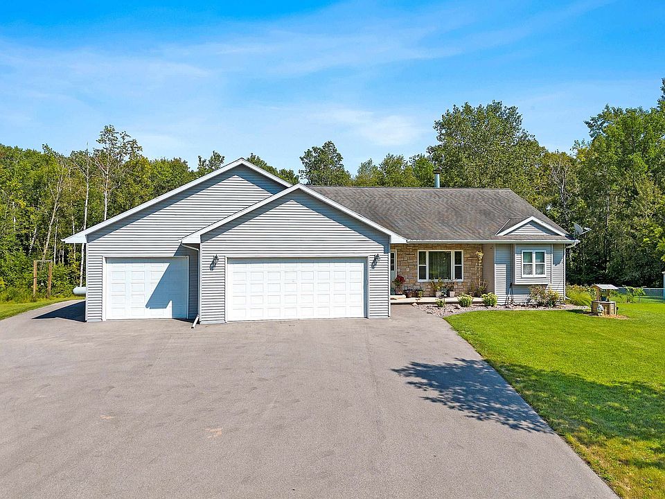 Just a short drive from Green Bay, this home welcomes you with tall ceilings and a stunning floor-to-ceiling stone fireplace. The primary bedroom offers a spacious walk-in closet with built-in shelving and the bathroom has a shower and jetted tub. Outside, enjoy a large, well-maintained pond with a sandy beach, an in-ground pool, and 7.89 wooded acres. The basement features a second living room area w/wet bar and multiple office spaces, perfect for a customized work-from-home setup. French doors open to a flex space ready for your touch. Additional highlights include garage-to-basement access, ample storage, a garden shed, first-floor laundry, and energy-efficient geothermal heating/cooling.