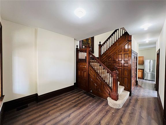 This Victorian home nestled on a large corner lot has been updated, all while maintaining the charming characteristics of the Victorian originality. Upon arrival, you will be greeted with a large front porch. Walking into the main door, you will find an ample entrance & hallway that opens to a generous living room, dinning room w/high ceilings and lots of natural light. Kitchen with new cabinets & appliance package including gas stove, microwave, disposal, dishwasher and refrigerator, retains a butler staircase. A half bathroom completes this level. The 2nd floor hosts 3 bedrooms, updated full bath and a conveniently located laundry. The entire 3rd floor is the Master Suite! Large bedroom with stunning views. Bathroom with stall shower. large closet, plus access to the attic, provides generous storage. Spacious, light-filled, absolutely dry basement with walk-out to backyard could be easily finished. 2 off-street parking spots. Brand new furnace, central air, electric and much more.