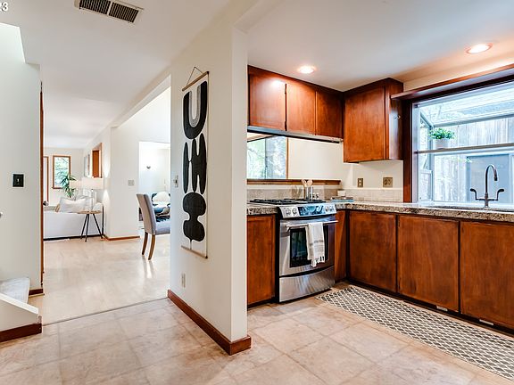Experience your own enchanted forest in this pseudo city cabin, with dedicated detached guest quarters or live/work space, in quintessential south Eugene location. Live a dream lifestyle in this perfectly proportioned home filled with charm, style and everyday comforts. The main level feels bright, open and airy in the expansive living room with maple floors, gas fireplace and French doors out to back deck. The adjacent sunroom/den features a vaulted ceiling with skylights, heated tile floor, and sliding door out to a side deck. The lovely kitchen offers granite counters, stainless gas range, atrium window with skylight, rich wood cabinets and opening looking onto the dining area with vaulted ceiling and more skylights. Upstairs primary bedroom with double closets, cantilevered sitting area and a partially vaulted ceiling making this room feel just as spacious as it is serene. The full bathroom is updated and cozy with heated tile floor. If that wasn't enough, there is a detached, permitted studio that is equally as impressive, featuring stained concrete floors, entryway with closet, storage and full bath, a living/work space with vaulted ceiling, full kitchenette wall, skylights, staircase to loft space and sliding door out to its own private deck. The grounds are tranquil, private, low maintenance, and offer equal space for both structures, including two separate sheds for garden/lawn storage. An idyllic property with potential income generating opportunity already intact. Make your dream a reality!