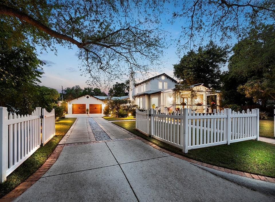 In a coveted West of Trail location within minutes of Southside Village, Sarasota Memorial Hospital, and Downtown Sarasota, this spacious home blends the historic charm of a classic farmhouse with a fully renovated modern interior. Situated on an enormous double lot, the primary house connects to a two-car garage with a separate dwelling unit that has its own exterior access, offering ideal space for an in-law or nanny suite. The home wraps around a courtyard with a pool that is beautifully shaded by established tropical landscaping for a picturesque indoor-outdoor lifestyle. From the deep porch at the front of the home, double entry doors open to a wide and brightly lit foyer that extends to a large dining area with oversized windows welcoming natural light from every side. Just beyond the dining area, a spacious living room with central fireplace leads to the meticulously renovated kitchen and an adjacent wet bar. The kitchen is a chef’s haven with stainless double-door refrigerator, double wall ovens, six-burner gas range, ample Shaker-style cabinets for storage and display, and granite countertops. Past the kitchen, there is an enormous amount of living space that flows from a large breakfast room to a separate lounge and a solarium with vaulted ceiling and wraparound windows overlooking the pool and rear yard. On the opposite side of the home from the kitchen and well-positioned for privacy, the downstairs owners’ suite encompasses an oversized bedroom with a full wall of sliding doors that open to a secluded patio, and a luxurious bathroom with dual vanities, glass-enclosed walk-in shower, and freestanding soaker tub. Outside of the owners’ suite, a spacious vestibule offers dedicated work-from-home space alongside the staircase that leads to the second floor. Upstairs, there are two bedrooms teeming with natural light, each with vaulted ceilings and access to a shared Jack-and-Jill bathroom. Through the breakfast room beyond the kitchen, a fully enclosed breezeway offers enormous storage and utility space leading to the spotless two-car garage and separate apartment entry. A door at the back of the garage opens to the bedroom of the suite, flowing to the kitchenette at rear where there is a separate exterior door to the back yard. Additional French doors in the bedroom open to the pool area. Exceptionally maintained by long-term owners and on the market for the first time in 27 years, this home evokes the beauty of Americana with reclaimed heart pine floors throughout, large bay windows, a standing seam roof, and a trellised front porch. Complementing the historic beauty, the thoughtful renovations, open flow, recessed lighting and oversized windows offer luxurious comforts. The Hudson Bayou neighborhood is highly sought after for its distinguished schools and proximity to Sarasota’s numerous lifestyle amenities, including shopping, dining, and quick access to the hospital and beaches.
