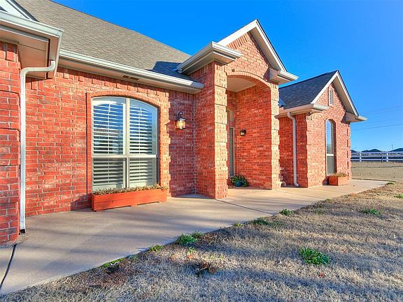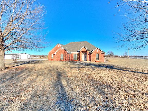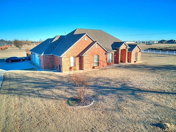 Are you looking for that slower pace of country life, but you still need amenities? Situated on 2.5 acres, this property has enough acreage to enjoy some breathing room, but not so much you are burdened by maintaining the land. You have a spacious corner lot, away from the hustle and bustle, but you are just a hop over to groceries, dining, gas, and other amenities. And for the commuter, you are just a couple miles to the HE Bailey Turnpike. Within minutes, you can be on your way to anywhere in the OKC metro! Step inside the entry and look to your left. You will find a formal dining space, that could easily flex as office space, a reading nook, piano room, or overflow lounge. Now head to the spacious living room, and you are greeted with a warm and welcoming gas fireplace. Also note the ample natural light from the two large flanking windows. The wood work and moldings give a sophisticated touch to this space. To your left is a beautifully appointed kitchen, with a stone-clad breakfast bar, oak cabinets, stunning tile work, accent and task lighting, stainless steel appliances, and a handy pot filler over the range! The eat in breakfast nook also features a gorgeous built-in dry bar. Heading back to the right of the entry, you enter a hallway that leads to a full bathroom and an office/4th bedroom with built in shelves and ample closet. To the left is the spacious primary bedroom suite. And what a retreat it is, featuring two vanities, a separate shower, jet tub, and massive closet with excellent built-in storage. Head back to the entry and turn left, and you will find 2 more secondary bedrooms with a jack and jill bathroom, a large utility room, guest powder room, and a safe room. The home also features a 3 car garage with insulated garage doors and a 30x50 foot shop with bathroom facilities, 220 amp service, built in organization, and gas heat. Saving the best part for last, escape to your private fenced patio for relaxing and entertaining with family and friends!