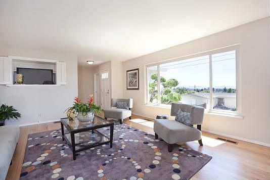 Lovingly maintained home with sweeping bay views. Well cared for with refinished hardwood floor & fresh paint throughout. Eat-in kitchen overlooks back patio & terraced backyard with fruit trees. Single level living space with chair lift from garage to house. Backs to open space.