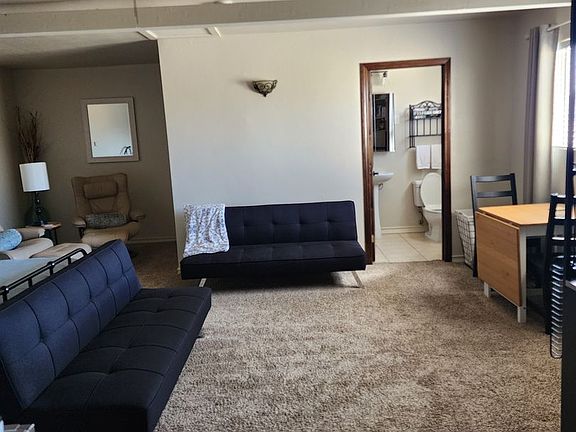 Located on west side of freeway and few blocks from the beach. The furnishings include a large bed, ceiling fan, separate sitting area with chairs, full bathroom with large shower, dining table and chairs, desk/office area at top of stairs, and kitchen appliances such as refrigerator, coffee maker, microwave, utensils, and more. The unit has a spacious open floorplan yet with small alcoves for various seating and work activities. Parking is on the gated driveway steps from the entrance and all utilities are included in the rent. And, extra bonus , access to a pool and laundry.