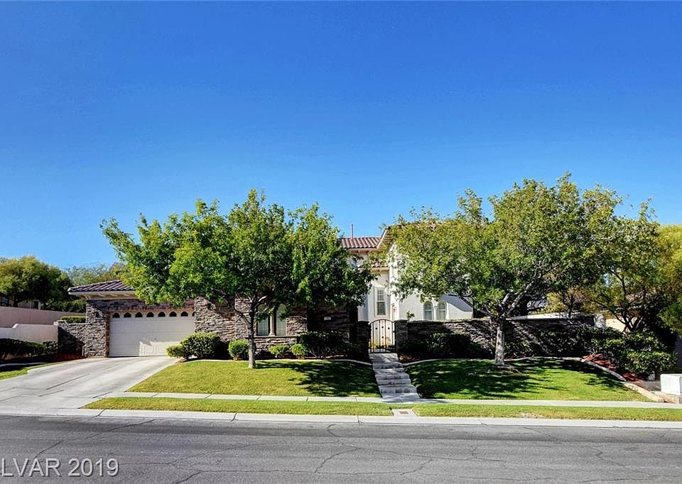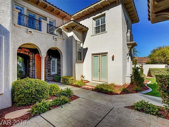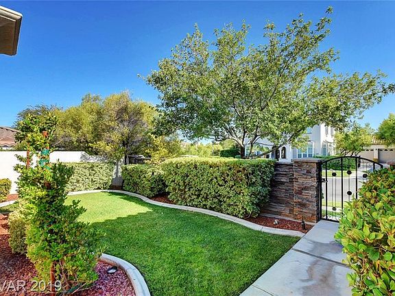 Beautiful home in Summerlin's sought after guard gated Vineyards community! 3 bds up, with additional downstairs den and attached 1 bd/bth casita w/ own entrance via courtyard. Extensive stonework in & out, custom stair rails, tons of storage & added cabinets, hardwood up & down, remodeled master bath with Neolith floors & slab granite, plus GIANT walk in closets, all upgraded baths, Covered shady porch, lush backyrd w/ ingrnd 10 person spa!