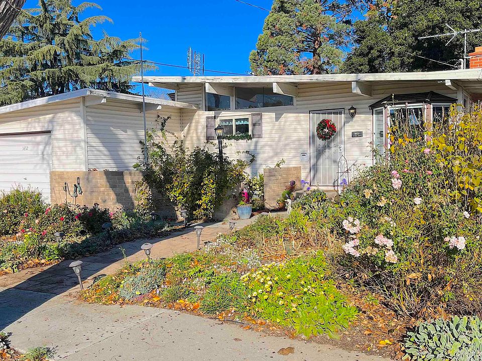 Wonderful Eichler-style home on quiet street. Beautiful hardwoods floors start at the front door and extend down the hall to the three bedrooms and kitchen. This home features a permitted addition off of the kitchen with its own free-standing fireplace and wall heater. The large eat-in kitchen features lots of counter space and a gas stove. The gorgeous remodeled primary bath is a spa-like retreat. This home also has many charming details including: lots of natural light through the trapezoidal clerestory windows, glass door knobs, custom raised panel doors, and beamed wooden ceilings. The roof has foam insulation which helps the home feel comfortable throughout the year. The partially dormant front and rear yards are a gardener's delight as they erupt in waves of color from the roses, sweet peas, lilacs, irises, hollyhocks and hidden bulbs. This one won't last.