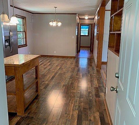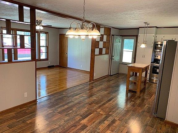 This home is being be sold with 4 acres. It has original Hardwood floors in BR's and Living Room. It has new laminate kitchen floors, paint, lighting fixtures and brand new stainless steel appliances. The HVAC unit is brand new as well. The detached garage is 900 sq ft and is heated. It also comes with an air compressor. There is a full basement with a garage door entrance on the back side of the house. There are lots of trees, a great flat yard and a covered patio/carport.