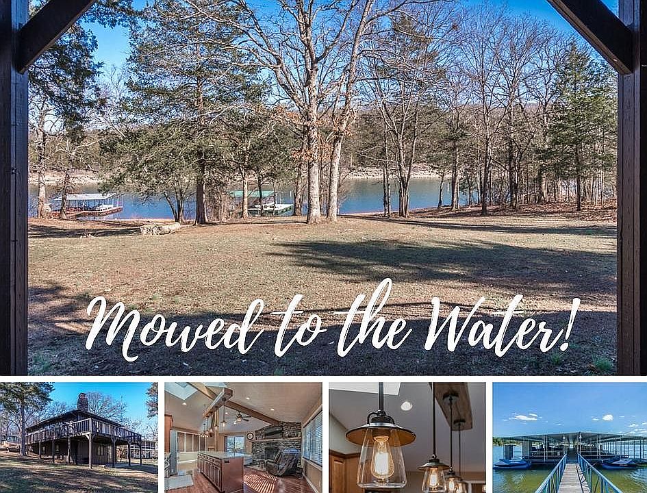 The ultimate Table Rock lakefront escape! Flat as a pancake, mowed to the water, and quite simply the most exceptional lake-frontage you will find on market in any price range. This isn't your family's old, run of the mill, 1970's lakefront cabin---COMPLETELY HGTV updated and move-in ready! Features include: Open concept and split bedroom floor plan, massive native stone fireplace, expansive deck & patio areas for entertaining, stunning fixtures & cottage style doors, warm & inviting hardwoods, tons of natural light, easy to maintain wood tile floors in XL, lower level, family room, all electric/all appliances included, water softener & whole house water filtration, & there are even 10'x24' & 28' boat slips avail. for add.$. You'll be the envy of all your friends, Lakefront on Table Rock!