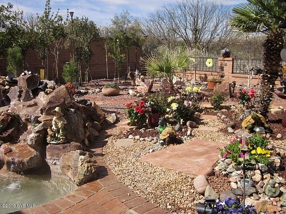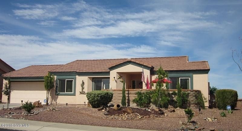 Hillside lot backs to arroyo that overlooks the golf course, with MOUNTAIN AND GOLF COURSE VIEWS! There are good mountain views from front courtyard and back yard. Extraordinary back yard, complete with water feature and huge covered ramada to enjoy the sunrises, sunsets, and views! Lots of color, too. Like to entertain? This is a WOW area! Very nice architectural details on inside: ceramic tile throughout, and bedrooms have gorgeous NEW carpeting. Split bedroom plan, too. Lovely SW decorator paint add color touches; living-dining area is large, and kitchen has a breakfast bar area and a family room that lends itself to many choices. Laundry room is a multi-tasking space--tons of cabinets and counter space, a desk area, and utility sink. Ample double garage.