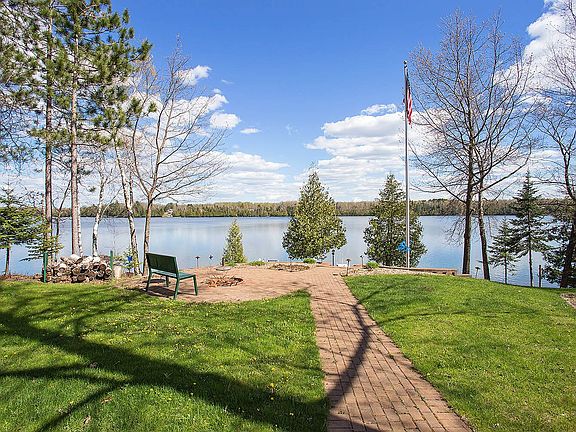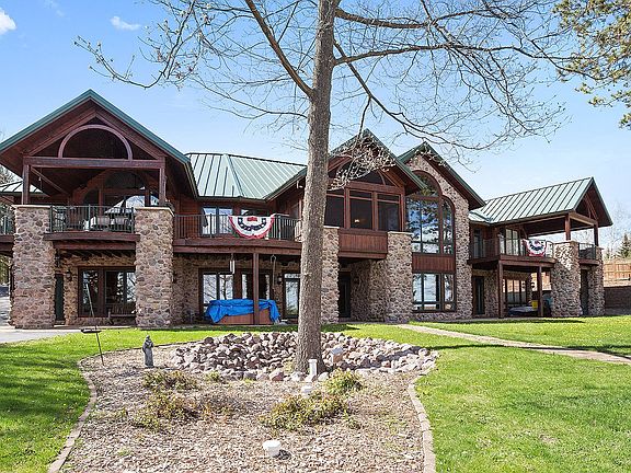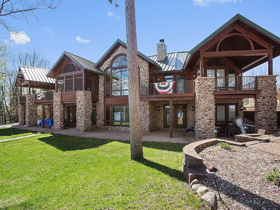 Custom built Derrick Erickson Maiden Lake home! No expenses were spared when this house was built. This is more than a lake home it is a retreat and the total "up north" lake experience. Whether you enjoy fishing, skiing, paddle boarding, snowmobiling or cross country skiing this resort-like home is the place you want to be experiencing it all at. Most rooms offer picturesque lake views. The main level offers an open concept great room w/ gorgeous stone walls & vaulted wood ceilings and a floor to ceiling stone fireplace. Two private Master Suites with each of them offering patio doors to their own private deck area. Sliding doors in the dining area open onto an enclosed 3 season's porch and a spacious deck with a covered porch area. The upper level has a separate suite, complete with living room, dining area, two bedrooms, a full bath and separate enclosed porch. The lower level boasts an open concept game room/ bar area/ family room with stone gas fireplace, office, two bedrooms and two full bathrooms. Step outside to enjoy the hot tub, fire pit area, lake and dock.