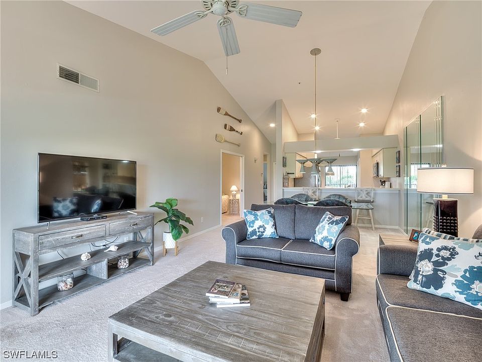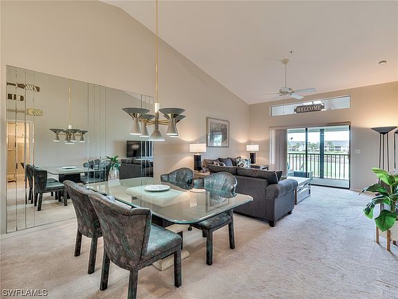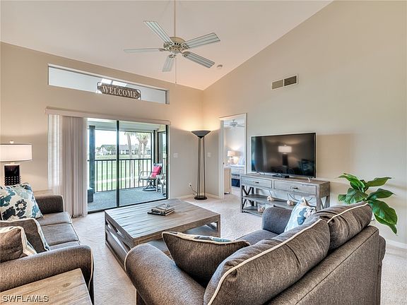 Welcome to your dream home with stunning sunset views over the golf course nightly from your lanai! This turnkey top floor unit features 2 bedrooms plus den, 2 bathrooms, front/back lanais, and 1 car detached garage. 13 ft vaulted ceilings add to the home's spaciousness and elegance. And its right next to the private community pool! Located in the coveted Kelly Greens community, this home offers the perfect combination of luxury and convenience. Kelly Greens is renowned for its prime location as the closest private gated golf community to the islands, just minutes away from Bunche Beach, Sanibel, and Ft Myers Beach.
