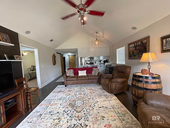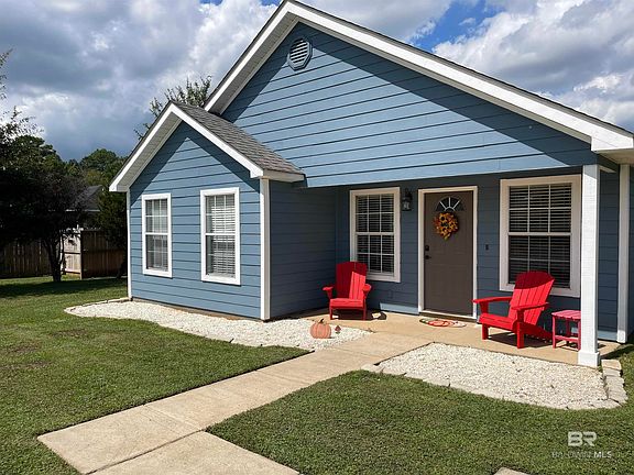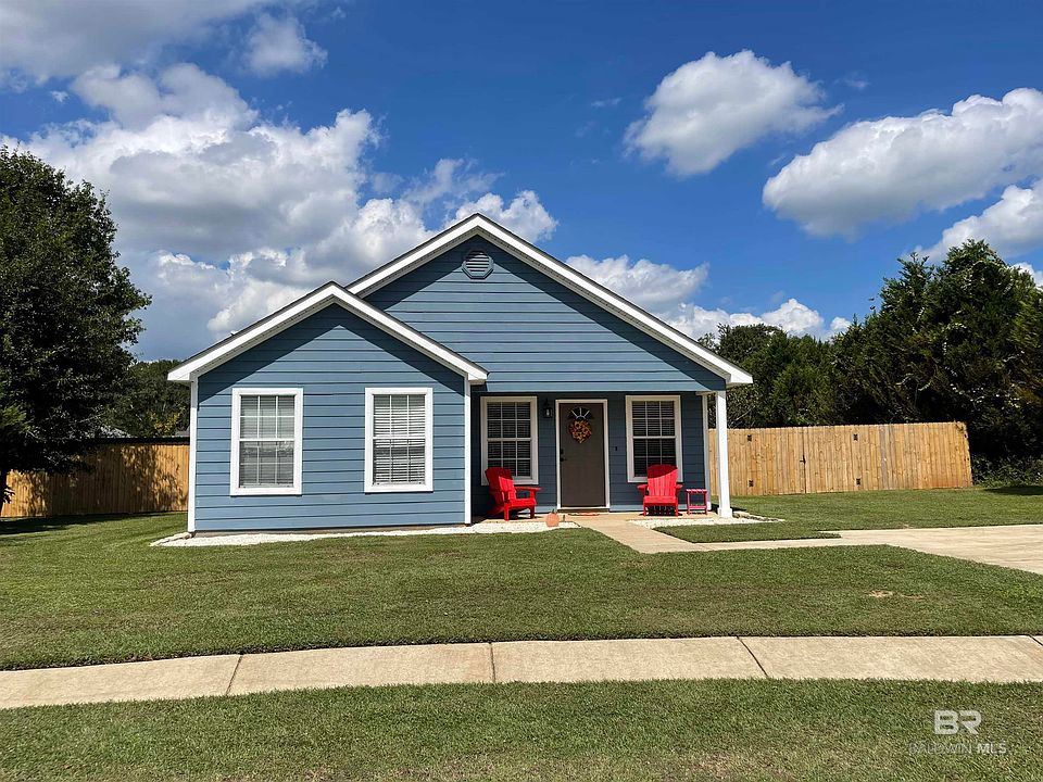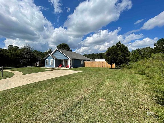 Nice 3 bedroom 2 bath home in culdesac with a huge yard. Open floor plan with vaulted ceilings in the main living area. Split bedroom floor plan with a large primary bedroom with ensuite bath. The other 2 bedrooms are good size that share a bath. Barndoors for pantry and storage closet. Nice size laundry mud room that goes out to the back patio. Laminate flooring in living area, primary bedroom and hallways, tile in kitchen, baths and laundry. Privacy fenced around the entire backyard. Fruit trees and owner pitching in zero turn lawnmower to make your yard work a breeze. New hot water heater, and dishwasher 2024. Entire exterior has been re-nailed, caulked and freshly painted 2024. Shed in the backyard for tools etc. freshly painted as well. Come enjoy living out... but convenient to everything. Interstate 110, Hwy 59, Hwy 90. Minutes from Robertsdale, Silverhill and Fairhope. Call today to make your appointment to view this home. Buyer to verify all information during due diligence.