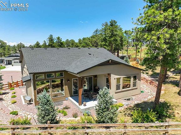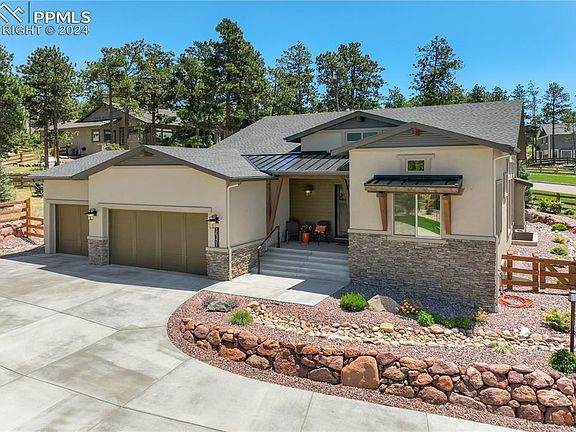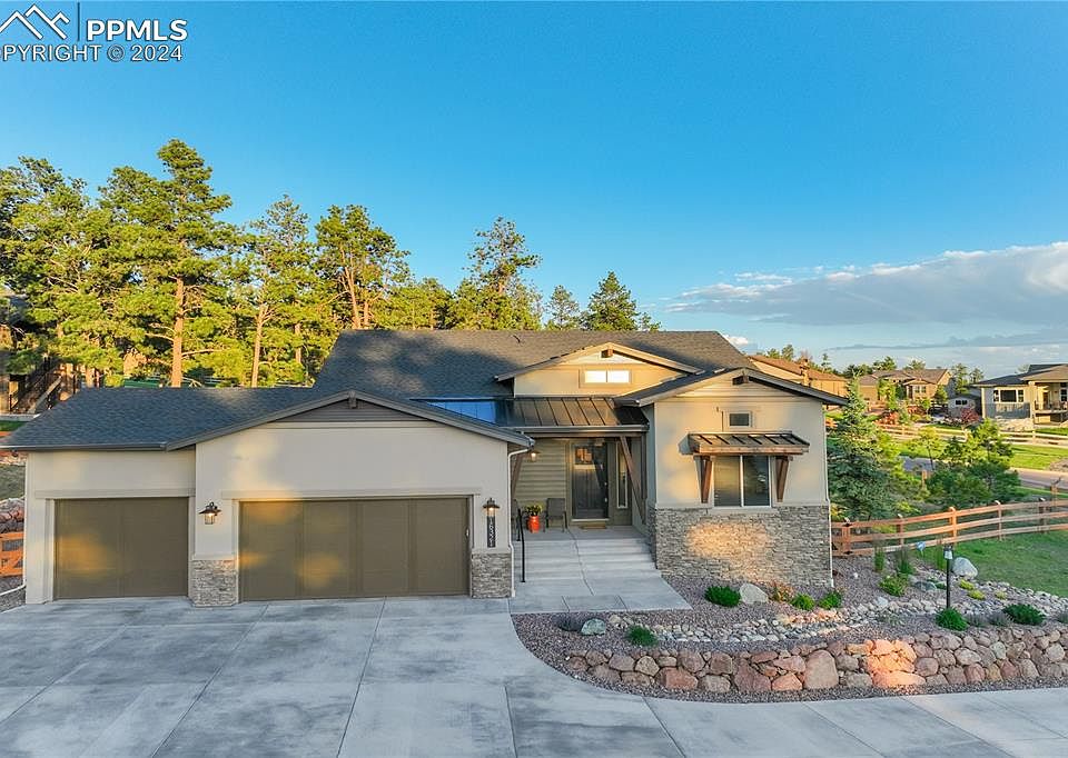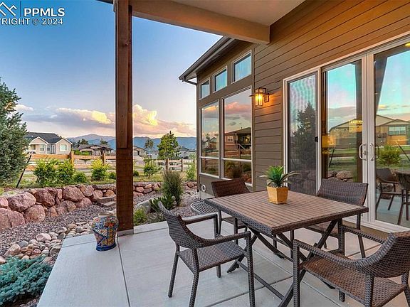 Luxury living in Sanctuary Pointe. Loaded w/upgrades, 2022 Built Saddletree Palisade on .45-acre lot on a cul-de-sac, offering awe-inspiring views of Pikes Peak. Walk to neighborhood park/playground, community walking trails & more. When you step inside, you'll be captivated by the impressive level of craftsmanship & attn to details. Loaded w/the latest modern amenities & designer finishes. Great rm w/beamed ceilings, flr-to-ceiling stacked stone feature wall w/FP wood mantle, flr to ceiling windows framing the views, solid oak hardwd flrs & wall of glass create an ambiance of sophistication. The gourmet kitchen has views of the mtns, high end cabinets, walk-in pantry, gas range top, wall mounted oven/microwave, expansive granite counters, oversized island w/brkfst bar & designer lighting. The adj dining area offers a large space to entertain surrounded by views. From here walk out to covered concrete patio w/built-in gas line, can lighting & access to the huge lvl fenced backyard. The private backyard has large gas firepit w/paver patio capturing Pikes Peak views.The main lvl primary suite has views of the landscape, sitting area, hardwd flrs, large walk-thru closet & barn dr to adj spa like bathrm. The 5pc primary bath offers tile flr, large dble vanities, custom mirror/lighting, a standalone soaking tub & large zero threshold shower w/bench. Main level office/bedrm has incredible views of Pikes Peak, plantation shutters, hardwd flrs & nearby full bath w/designer tile floor.Modern black metal railing leads you down to the finished bsmnt. Open family rm w/ wet bar. 2nd suite in lower lvl offers textured carpet & private full bath. 2 add large lower lvl beds both have deep closets and easy access to hallway full bath. Main lvl laundry/mud rm w/sink, cabinets & hanging racks. Protected private front driveway w/rm for multiple vehicles. This new home offers all the modern amenities on a private lot minutes from D-38 schools, shopping, entertainment, USAFA, & I-25.
