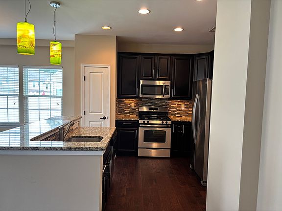 This stunning 3 bedroom, 2.5 bathtrom, and 2 car garage townhome features an open floor plan with kitchen, dining and family room all with beautiful hardwood flooring throughout the entire first floor along with full wood stairs and iron railings. The kitchen has granite countertops, stainless steel appliances, a breakfast bar, and two pantries. Big master bedroom with a tray ceiling and a walk-in closet; en-suite with a soaking tub, separate shower, and dual sinks with granite countertops. All bathrooms have tile flooring and shower surrounds with granite countertop vanities. Great location close to I485, shopping, and dining as well. 1 small dog, 25 lbs and under, is conditional with a non-refundable pet fee, no aggressive breeds. Pet fees will be determined by the outcome of pet screening. Security deposit will be determined via the outcome of the background screening.