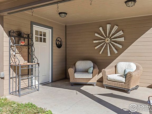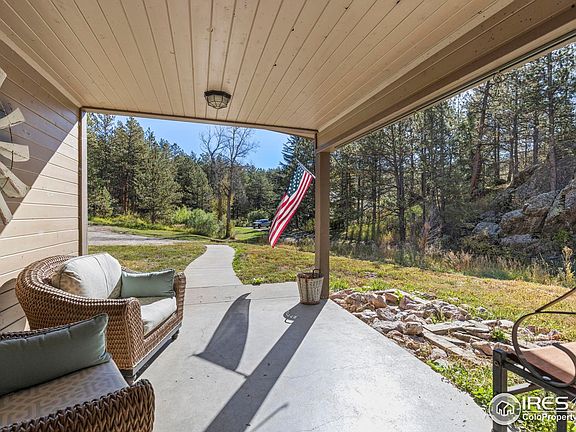 Nestled among nearly 6 wooded acres just minutes from Pinewood Reservoir, this well-maintained mountain home combines comfort, privacy, and natural beauty. The property features a seasonal stream that winds through rock outcroppings, creating a peaceful backdrop for enjoying the outdoors. Relax on the front porch or entertain on the stamped concrete patio surrounded by trees and wildlife. Inside, the inviting open floorplan includes a bright sunroom, vaulted ceilings with exposed beams, and a tastefully updated kitchen with stainless steel appliances, quartz countertops, and a tile backsplash. The spacious primary suite offers a walk-in closet and private 3/4 bathroom with heated tile floors, dual sinks, and convenient laundry. Two additional bedrooms and a full bathroom complete the home, providing plenty of space for guests. Practical upgrades enhance everyday living, including new carpet throughout, abundant storage, and thoughtful finishes that maintain the home's warm mountain character. Outside, you'll find a detached two-car garage with a 220-volt outlet for EV charging, plus two versatile sheds - one housing the well equipment and the other heated with additional storage. With extra parking for an RV or camper, there's room for all your Colorado adventures. Located just west of Loveland with quick access to Pinewood Reservoir, Carter Lake, and countless outdoor opportunities, this property offers the perfect balance of seclusion and convenience. Experience mountain living at its best - a retreat you'll love coming home to.