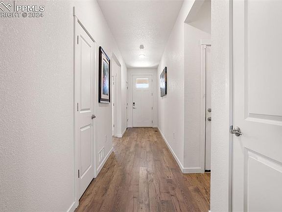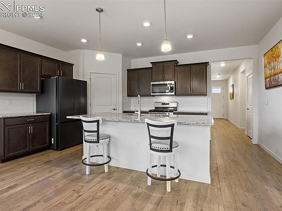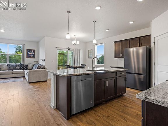 Experience quiet living in this sought after Monument neighborhood! Located on the west side of 1-25 with close mountain views throughout the community as well as two parks, one complete and the larger soon to come. This amazing 1.5 year old home features 4 bedrooms and 2 baths with main level living and a huge unfinished basement with bathroom pre-plumb and radon system pre-plumb, for room to grow. As you enter the home you will be greeted by natural light and the airiness of this open concept floor plan. This home features wood laminate throughout the hallways, living room, kitchen and dining room, carpet with upgraded padding in the bedrooms and tile floors in the bathrooms. Both bathrooms include quartz counter tops. The open kitchen showcases a large granite island, granite countertops, gas range and stainless steel appliances. The living area is warmed by a corner gas fireplace. Off the living area is the master bedroom with a large walk-in closet and built-ins and a master bath with a large shower and double vanity sinks. This home includes a smart home system with smart locks and smart lighting as well as solar. Off the dining area, you walk through the sliding glass doors onto the composite deck that has been upgraded to include an enclosed sunroom with an incredible view! The composite stairs lead you down into the large backyard with rock and artificial grass. Wood fencing also surrounds the home, with gates on both sides.