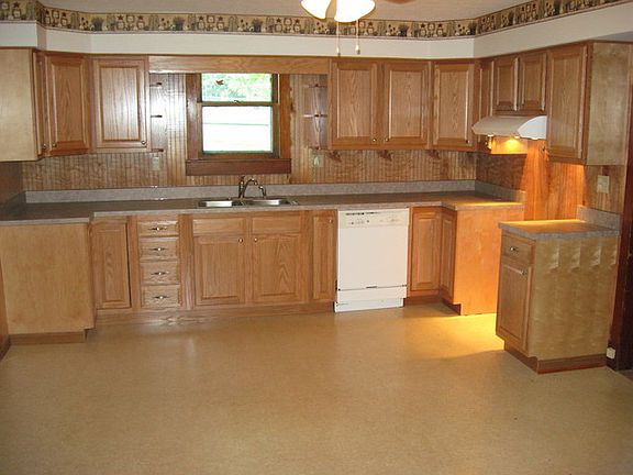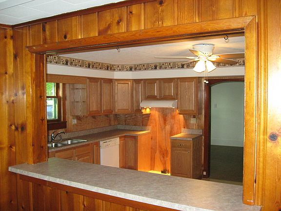 Four bedrooms, 1 bath. Living room is beautiful with knotty pine, gas fireplace, and built-in display case. All new kitchen. Many updates include: drywall, flooring, windows, hot water heater, updated electric service & septic (2006). Two detached garages--one is a 2 car, the other a 2 1/2 with a pole barn. Lots of value at a price to brag about!