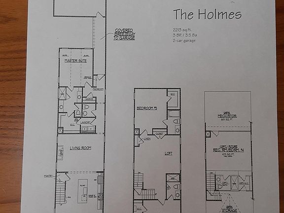 HOLMES - 2 story with unfinished 3rd floor. Dining in front. Kitchen has large island, granite counter tops. tile backsplash, stainless steel appliances, custom cabinets. Living room with fireplace off kitchen. Master down with large walk in closet wood shelves. Master bath has walk in shower, separate vanities, water closet. Laundry room on first floor. Mudroom leads to patio with breezeway to 2 car rear entrance garage. 2 bedrooms up each with own bath separated by large loft. Fiber cement exterior.
