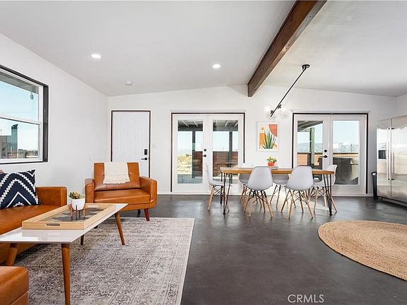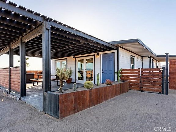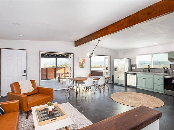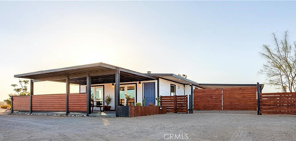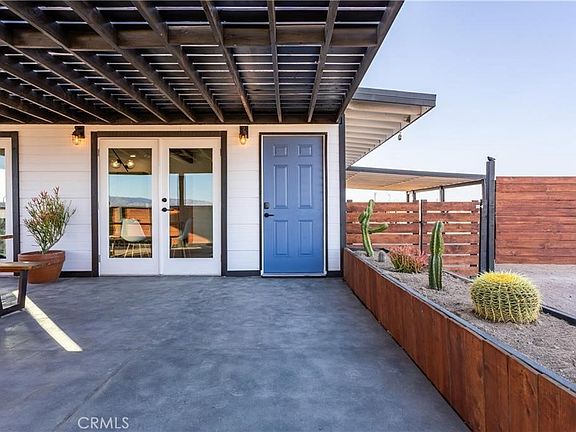 Welcome to Casa Conejo 29! Beautifully designed, remodeled, solar, 360 degree views, fully furnished, turnkey. This mid-century modern home is a very popular short-term rental with 100+ 5 star reviews. No detail was spared on this remodel. Situated on a large parcel with a stunning desert backdrop offering glowing sunsets and big views. Pulling into the driveway you’ll be surrounded by cacti, unique trees, and other desert flora. This one of a kind mid-century modern desert gem will ignite your sense of adventure. Freshly painted in white with dark trim that amplifies the 1950's design. Walking in you'll find stained concrete flooring, dimmable smart lights, original exposed beams, and custom modern light fixtures. The open floor plan makes entertaining a delight. Fully equipped with new cabinets, custom concrete countertops, and stainless steel appliances: refrigerator, stove, and dishwasher. The gorgeous bathroom brings a fresh new look with walk-in shower, new vanity, and mirror. The bonus room is the perfect space to unwind and watch TV or perhaps turn it into a home office, gym, or extra bedroom. Each bedroom is spacious and comes equipped with their own mini split heating and cooling systems, smart lighting, and individual sliding glass doors to the exterior. Enjoy the primary bedroom's "reading nook" with reclaimed wood wall and natural wood ceiling. One truly special feature of this home is the two large French doors in the living room open up to the covered patio space with Jacuzzi and grill creating an incredible indoor/outdoor area that’s customizable. Relax in the Jacuzzi and take in the panoramic views. Additional features include mini split heating and cooling systems, new electrical, new lighting, fully fenced-in yard, and more. Equal distances to downtown Joshua Tree or downtown 29 Palms offers flexible and convenient accessibility to both town's shopping and restaurants, or respective National Park entrances.