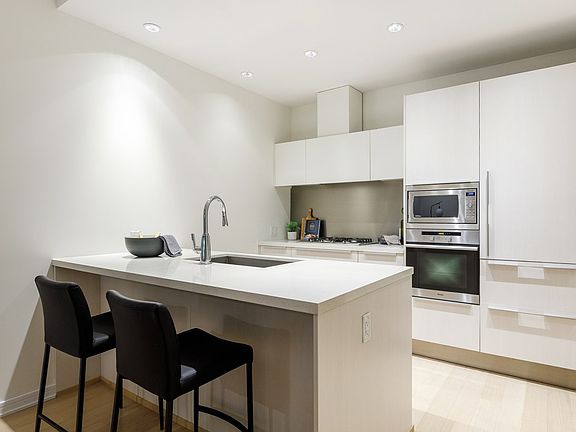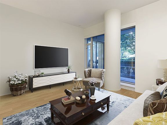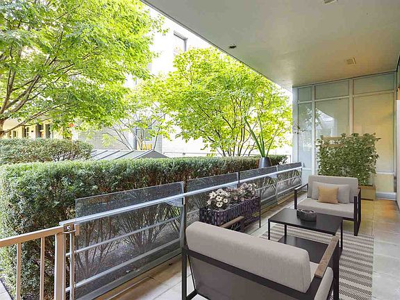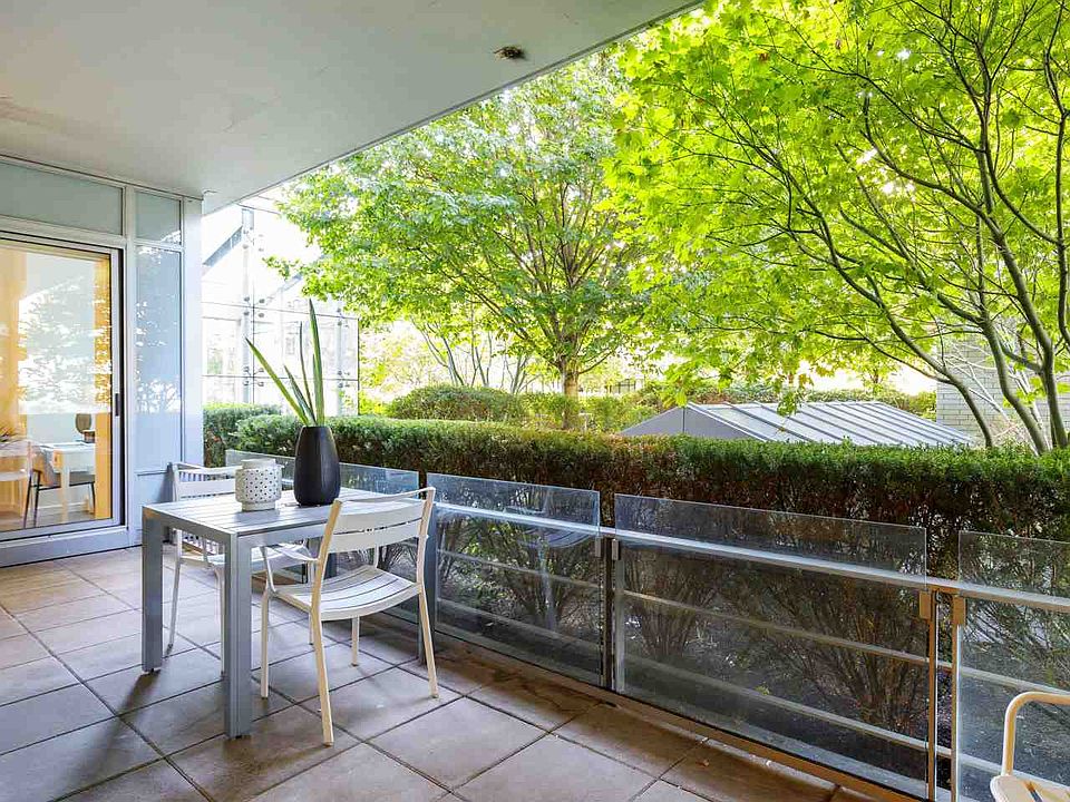 Tranquil, luxurious patio home a level above others, nearly 1100sf indoors and 150sf patio facing the private, quiet western courtyard. One-level living w/ 10 ft ceilings, air cooling & sharing no walls. Elegant Eggersmann white cabinetry & quartz counters, integrated Subzero fridge & S/S Miele appliances with gas cooktop & oak hardwood flooring. Open layout permits 8-person dining & house-sized furniture, w/ satellite bedrooms, ample closets, bright office & 5-piece ensuite with dual vessel sinks. Adjacent to Olympic Village's newest park, steps to the seawall, Urban Fare, Craft, London Drugs & skytrain. Kayak & Gold Medal Club amenities incl concierge, 2 gyms, steam, sauna & pool. 1 parking spot & 1 ample-sized locker.