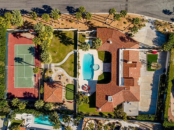 FIRST TIME ON THE MARKET IN OVER 21 YEARS! An incredible opportunity to own a fabulous tennis estate on just under 1 acre of land (2 separate lots where you own the land) in the most desirable neighborhood of Andreas Hills in the South End of Palm Springs. Located on a quiet cul-de-sac, an automatic gate opens to a large motor court and a five-car attached garage, with plenty of on-street guest parking. The main house offers three ensuite bedrooms, plus powder room, and showcases breathtaking views of the magical mountains from almost every room. Upon entering you are welcomed in by the generous formal living room with fireplace and views of the pool and mountains beyond. Adjacent is the formal dining room conveniently placed off the kitchen with adjoining breakfast nook. The primary retreat enjoys a cozy fireplace and spacious soaking tub with bath; the two guest bedroom suites are privately situated from the primary, one with a charming spiral staircase to a comfy loft and outside access. The 5,856 sq ft of living space includes a 2/2 guest house located on the tiered lot below with one of the guest rooms currently used as an exercise studio, as well as a North/South facing Tennis Court and putting green. Large pool with separate spa, outdoor fireplace with an attached built-in BBQ and plenty of room for additional sport courts or other recreational activities. The property is priced for the new Buyer to take it to the next level.