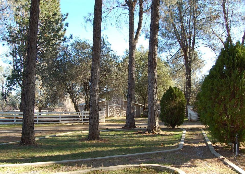 Gated entrance to 6 acres of horse property. Peaceful setting with large trees, fenced turn-outs, 3 stall barn, above ground pool, covered parking area and out building. Spacious home with 3 bedrooms, 2 baths, separate living/family rooms and office. The open kitchen with island cooktop has bar seating in addition to a formal dining room. Large covered porch overlooks the property