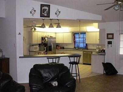 - Blinds, Breakfast Bar, Open Floor Plan, Wood Cabinets, Counters-Solid Surface