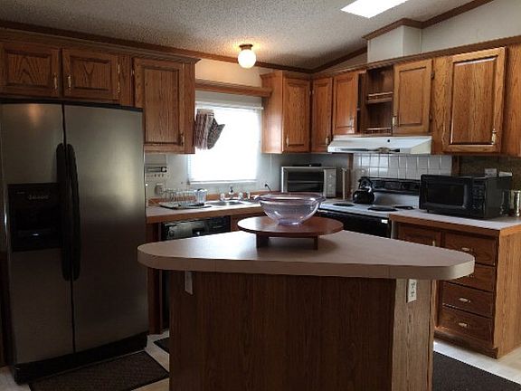 Custom built 2/2 manufactured home-finished on site-cannot be moved. Home on 1/2 acre lot in retirement community w/clubhouse & pool. Beautiful Oak tree in front. Dining & Kitchen combo w/island & skylight. 12x28 room was added to front of home. Separate office/hobby room. Nice brick work on steps to the main & carport entrance. Jacuzzi hot tub, new carpet, handicap ramp. Lot has concrete RV Pad & full hook-up. 3 storage buildings-1 is insulated & has window A/C unit. Asphalt road & driveway