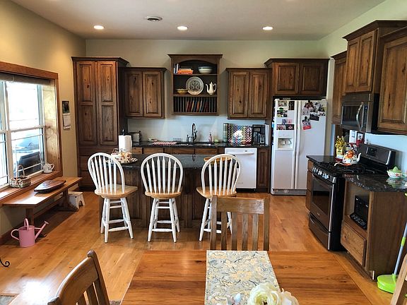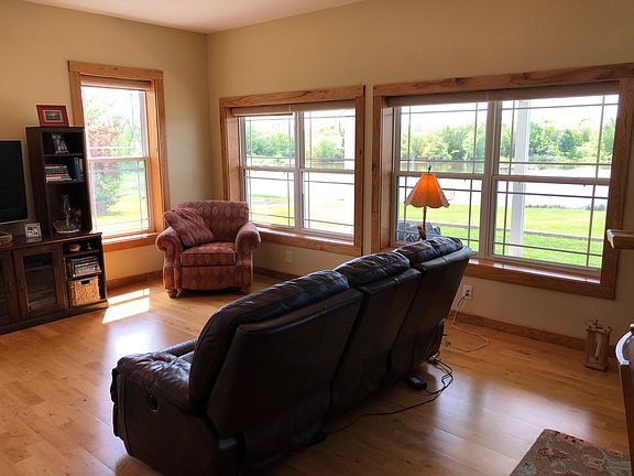 A three bedroom two-bath maintenance free home nestled close to two ponds (2 ½ & 4 acres) on 28 plus acres, with a scenic view that can be seen from most windows. This is a wonderful home for anyone who enjoys the outdoors. Imagine being able to fish just a few feet from your front door anytime you want. Deer and turkey can be seen from the windows and every spring geese build a nest on the island. The interior of the home has 1,860 square feet of living space with radiant floor heat, tankless water heater, hickory custom encased windows and beautiful hickory kitchen cabinets with granite counter tops. The exterior walls are nine inch thick and fully insulated. A covered large viewing porch is attached to the front of the house as well as an 1,100 square foot finished heated garage. The house is located in the country, but actually has a paved road. For more information contact OB at 785-851-6852.