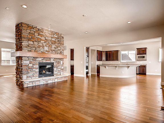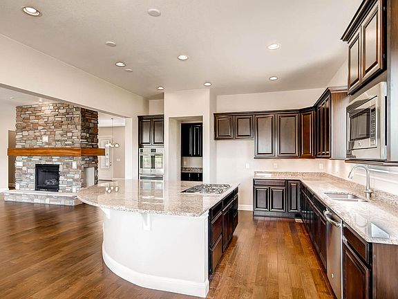 Breathtaking mountain views and open space vistas welcome you home to this gorgeous ranch model on a beautifully landscaped 1/3 acre lot in Leyden Ranch. Generous, open floorplan with high ceilings, wood floors, and custom designer lighting flows from room to room for ideal entertaining. Cook with family and friends in the expansive Chef's kitchen with expresso cabinets, upgraded granite countertops, stainless appliances including a gas cooktop and double ovens, oversized island and picture perfect mountain views. The butler's and walk in pantries provide abundant storage. At the heart of the great room is the statement stone fireplace that provides warmth and ambience in the home. Retire to your palatial master suite with more mountain views and patio access for endless nights of star gazing. The master bathroom with custom barn door has separate vanities, a soaking tub and the largest walk in closet imaginable. Need to work from home? The spacious office with French doors is the perfect spot. Spend time outdoors watching the sun set over the mountains from your extended covered patio or flagstone patio with fire pit. Full unfinished basement for your future space needs and a three car garage for all your toys. Fantastic schools, miles of trails and easy access to shopping, restaurants and the mountains make this your perfect home!