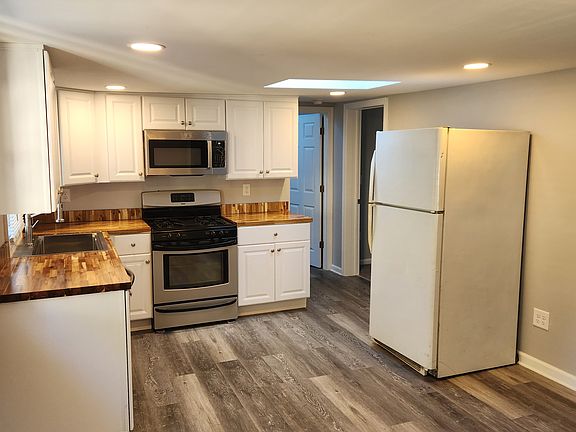 The remodeled kitchen features new cabinets, warm toned butcher block counter tops and stainless dishwasher, microwave, gas range and oversized versatile sink. The kitchen also has a large eat-in area with pantry and is abundantly well lit complemented by a skylight.