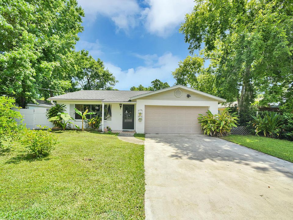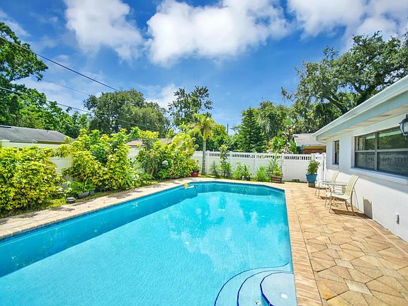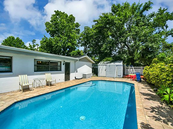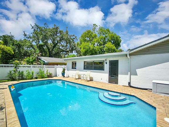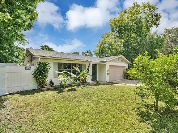 This property is more than it looks from the front! In at just under 1700 sq. feet. This 3/2 home has a freshly refinished solar heated pool (w/10 yr warranty), brick paver deck, 6 ft white vinyl privacy fencing and beautiful landscaping in the backyard. Your year-round oasis. BBQ on the large wood deck, and make loads of memories around the sparkling pool. Home boasts a large living room with 18 in ceramic tile floors. Mediterranean Style Kitchen with peninsula breakfast bar and LOADS of Storage, Including a sizeable pantry. Newer appliances including a gas range. The AC and water heater are less than 2 years old. New carpet and paint in 2 bedrooms and the warm family room which is equipped with a large storage closet and custom made television stand that match the wood framing and