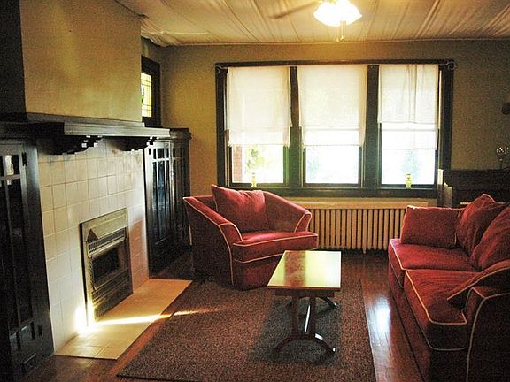 Welcoming front porch and so much charm! Stunning woodwork throughout starting at the original front door. Mission style built-ins on either side of decorative fireplace, pocket doors between living room and dining room, stained glass windows and hardwood floors, large kitchen with original refinished cabinets. This home also features a small den on main floor, large basement with full bath plus a mud room accessed from the kitchen leading to the lovely rear patio & gardens and 2 car garage.