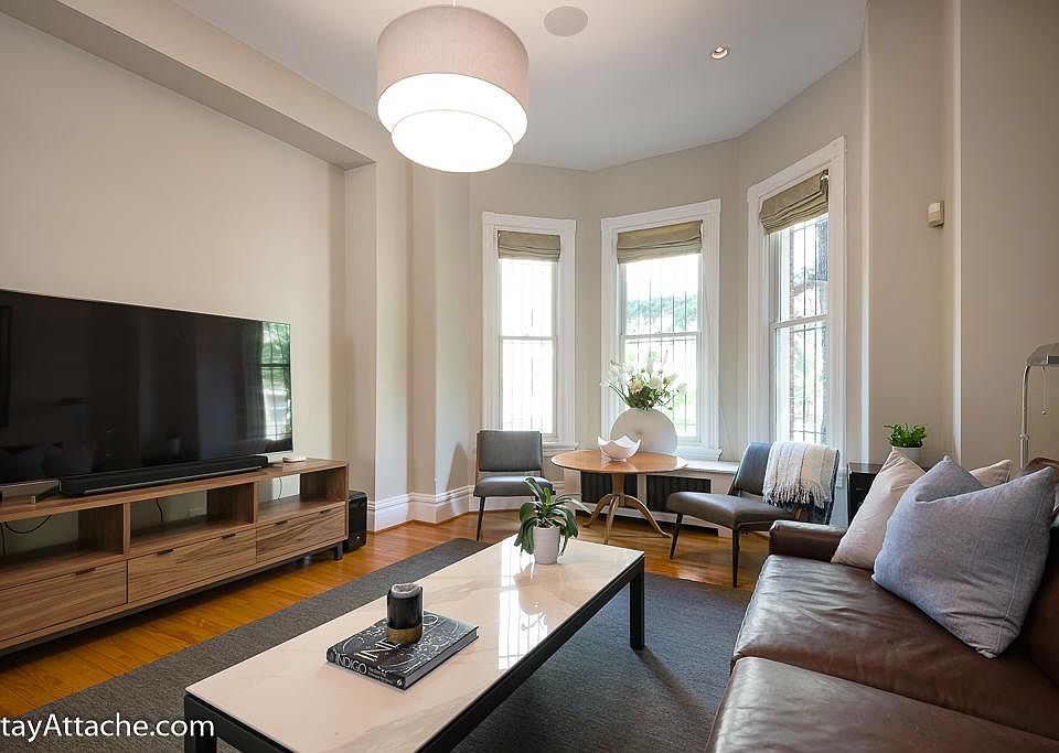 This newly furnished, spacious, light-filled 3-bedroom, 2-bathroom row house is located in the heart of Dupont Circle. The property features an updated bathroom and kitchen. This property has all the amenities one could need including a spacious living room, three spacious bedrooms with double-size beds, that allows for seating areas, 12-foot ceilings, decorative fireplaces, a shared back patio area with a shared gas grill, hardwood floors throughout, dining table, stainless steel appliances, granite counters, gas stove, dishwasher, HDTV, central air and heat, washer and dryer in-unit. The renovated master bathroom has Hotel style walk-in tiled shower, Tile floor, marble vanity. The property is just blocks away from grocery stores, shops restaurants, and more. The Dupont Metro Metro Station (Red Line) and U St Metro (Green Line) is less than an 8-minute walk. Walk score: 98, Transit score: 93, Bike score: 94. Please note that the property does come fully furnished and requires at least a 30-day stay in order to book. If you would like to proceed with renting the property, we do ask that you fill out an application with us directly. Applications are processed on a first-come, first-served basis. Please inquire for more information. The property is fully furnished and includes all utilities including WIFI.